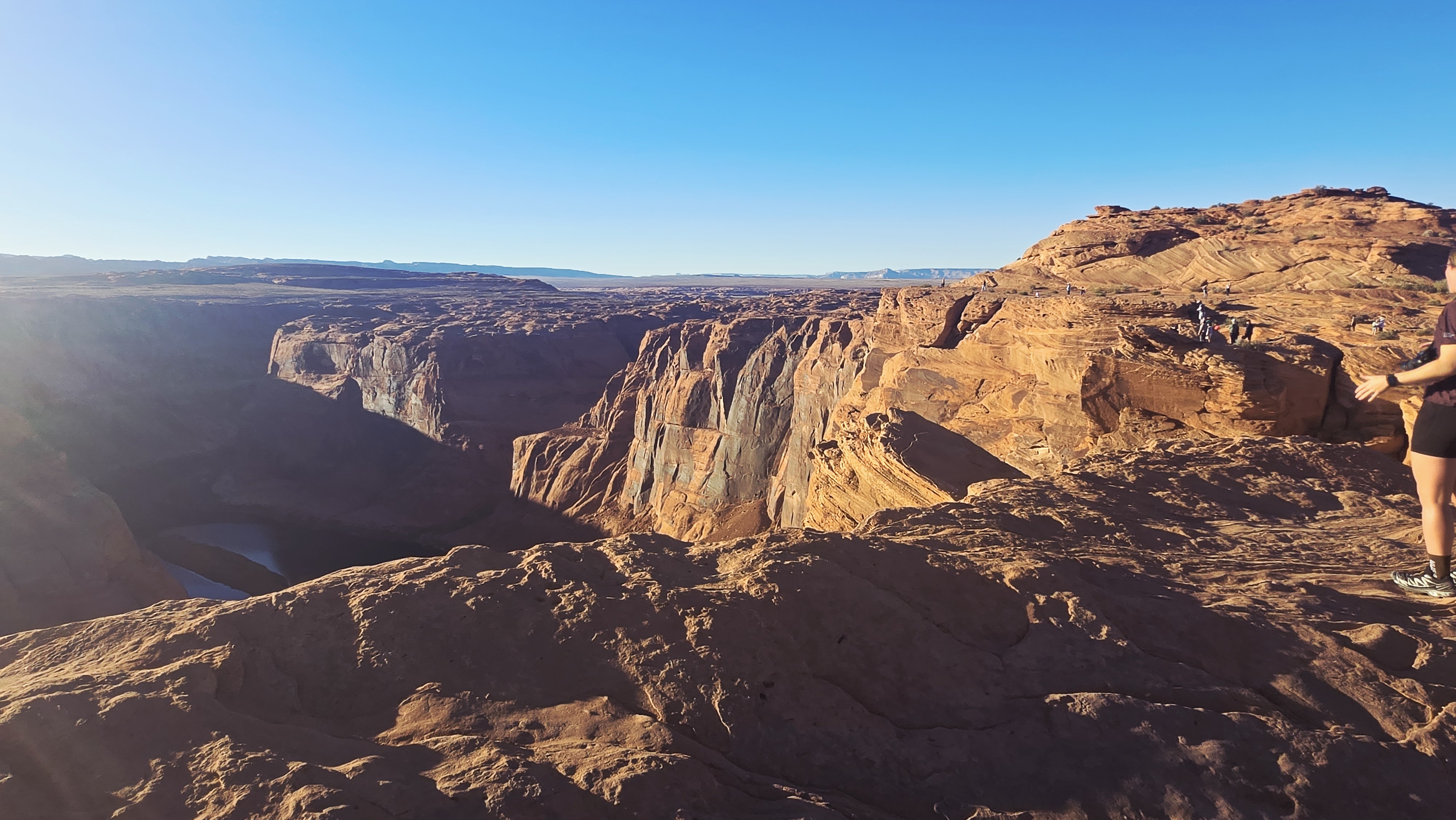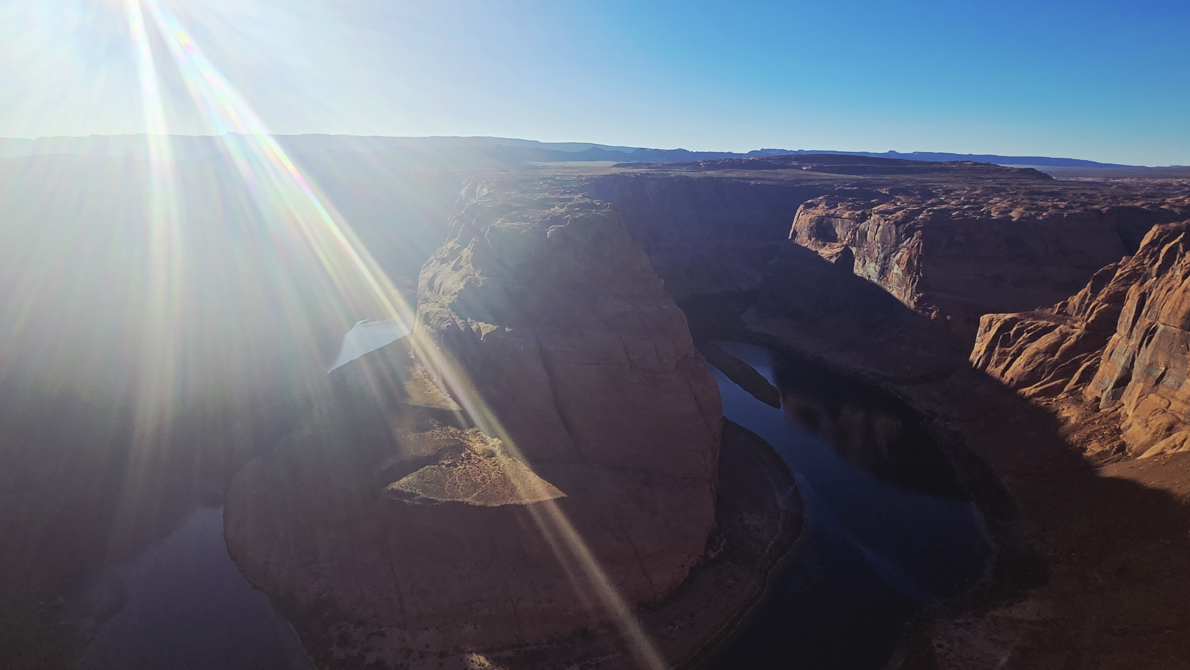 절벽 아래로 깊게 휘도는 콜로라도 강은 햇살에 따라 색을 바꾸며 빛난다.