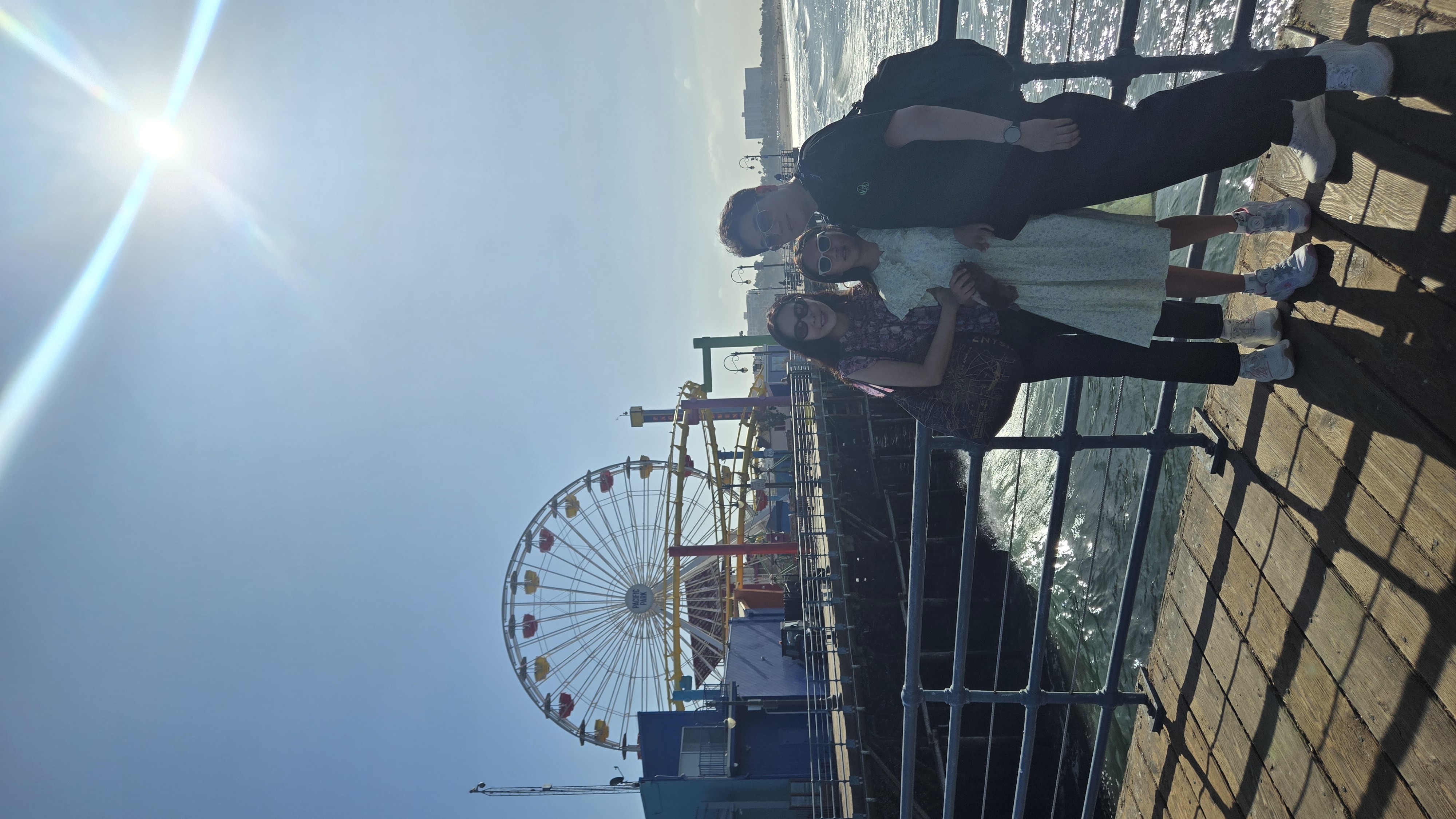 멀리서 보이는 **산타모니카 피어(Santa Monica Pier)**의 관람차와 놀이기구, 그리고 거리 공연자들의 공연이 어우러져 여유로운 느낌이 들었다.